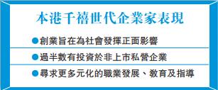 報告指出,本港年輕企業家創業旨在為社會發揮正面影響,多於獨立自主或實現理想生活方式;過半數千禧世代企業家有投資於非上市私營企業,而該比例在其父母一輩中為略高於三分之一;而相較於55歲及以上的企業家傾向由實踐中學習,千禧世代企業家則尋求更多元化的職業發展、教育及指導。