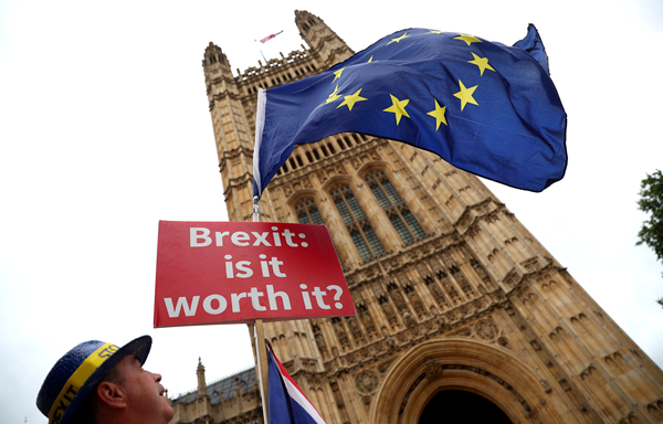親歐派人士在英國議會外示威,抗議文翠珊的脫歐策略。標語寫着:脫歐值得嗎? 路透社