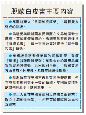 【香港商報网訊】英國政府昨日發布脫歐白皮書,就英歐未來貿易和合作關係提出「全面設想」。首相文翠珊表示,白皮書將為脫歐進程提供一個有原則性且實用的方向。