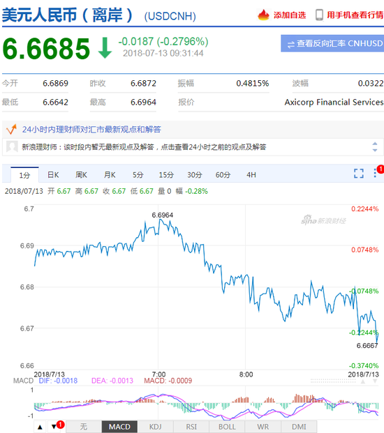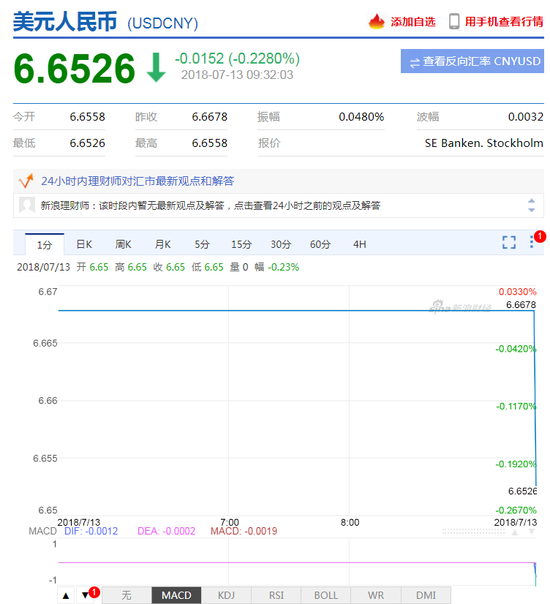 7月13日,在岸人民币汇率开盘快速拉升,收复6.66关口报6.6526,离岸人民币收复6.67关口,报6.6685。