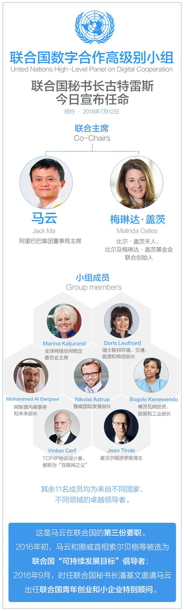 7月12日,联合国秘书长古特雷斯宣布推出数字合作高级别小组,任命阿里巴巴集团董事局主席马云、比尔及梅琳达·盖茨基金会联合创始人梅琳达·盖茨为联合主席。该小组旨在通过跨领域和跨国界的合作,挖掘数字技术的社会和经济潜能,确保所有人都能受益于一个安全普惠的数字化未来。