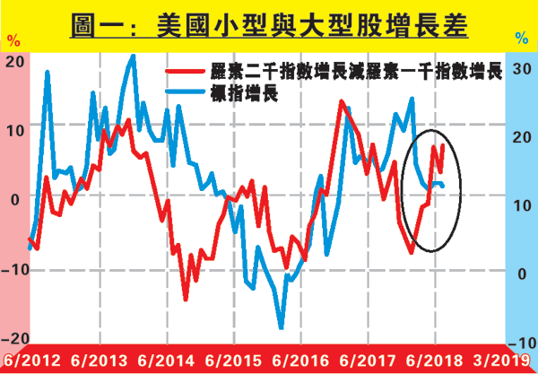 參考近月美股走勢,投資者亦未有大舉離場迹象,尤其是自特朗普年初開始密謀貿易戰,小型股表現更優於大型股。圖一顯示羅素二千指數增長減羅素一千指數增長年初至今明顯抽升。在貿易戰前景變數仍多下,小型股受投資者歡迎;由於小型股銷售市場主要受內需多於貿易支持,不易受到匯率變動及貿易環境影響,加上美國基本面近季表現向好,尤其是零售銷售增長升幅明顯,因此利好小型股業績。