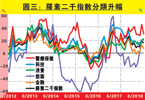 圖三可見羅素二千指數在過往6年大部分時間均增長不錯,相信小型股回報對投資者有一定吸引力。板塊方面,圖中可見能源類表現大部分時間遜於大市,相反醫療保健及科技股則跑贏大市,近年更明顯拋離,加上這兩個板塊暫時與貿易戰無直接關聯,相信防守性應不錯。