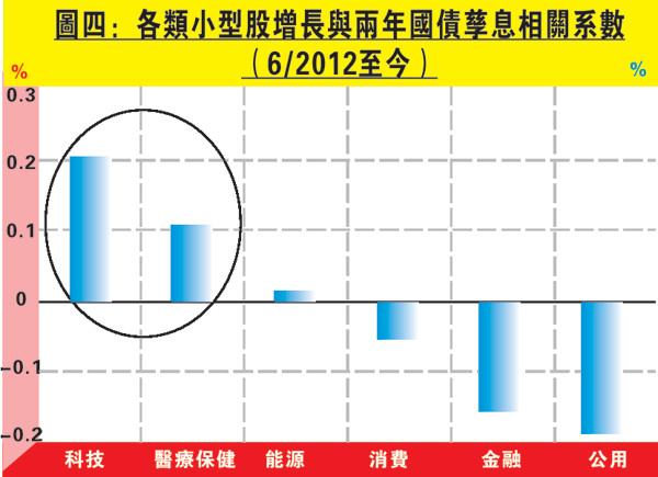 另外,聯儲局加息步伐將是投資者關注焦點之一。短期國債孳息反映貨幣政策預期,因此在加息的前景下,美國兩年國債孳息應見上升。然而圖四可見,各類小型股與兩年國債孳息關係整體不太強,唯獨醫療保健及科技股增長與兩年國債孳息成正比,可見這兩個板塊增長將略受惠於加息。