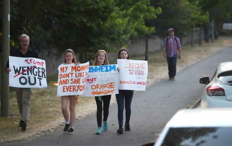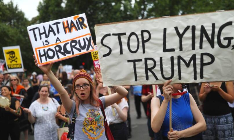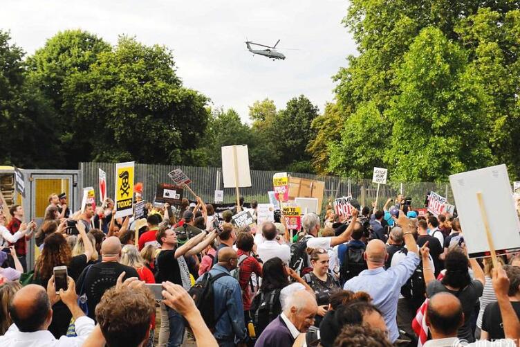特朗普乘直升机抵达莱尼姆宫时,抗议人群聚集在宫殿附近对着直升机进行示威。