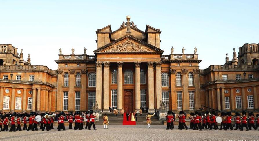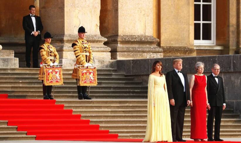 特朗普夫妇乘直升机抵达了布莱尼姆宫,特里萨•梅和她的丈夫菲利普对他进行了迎接。