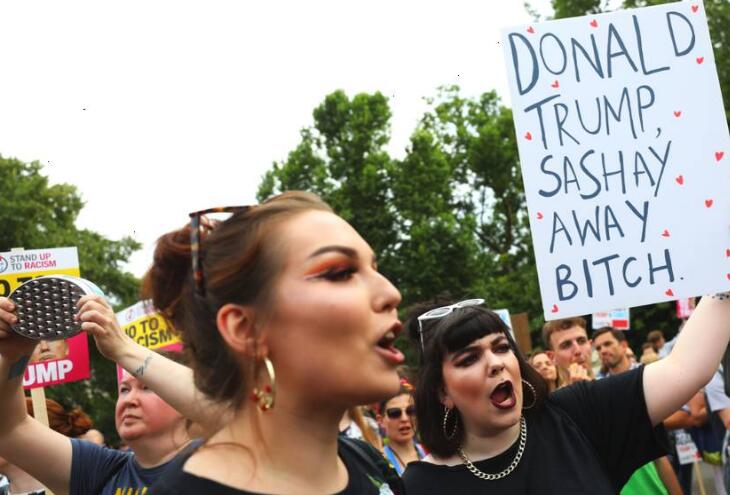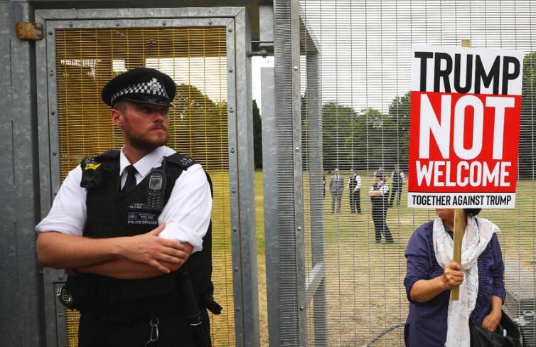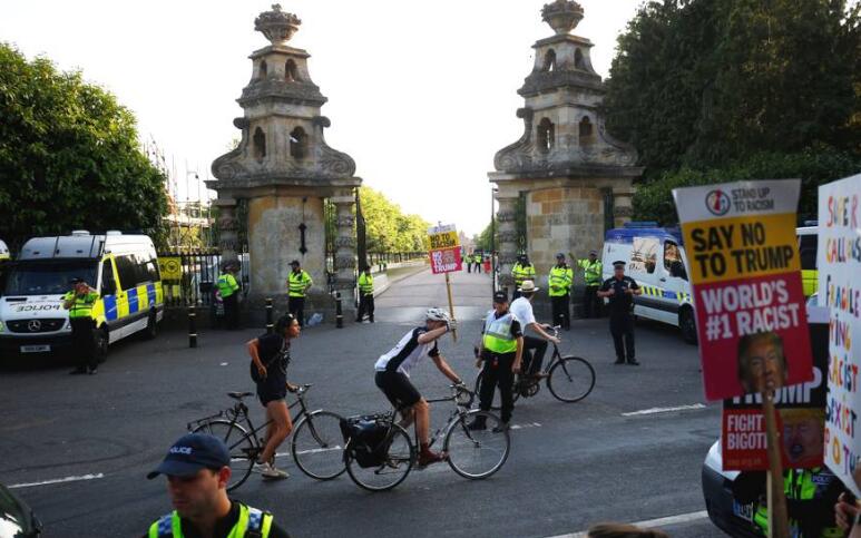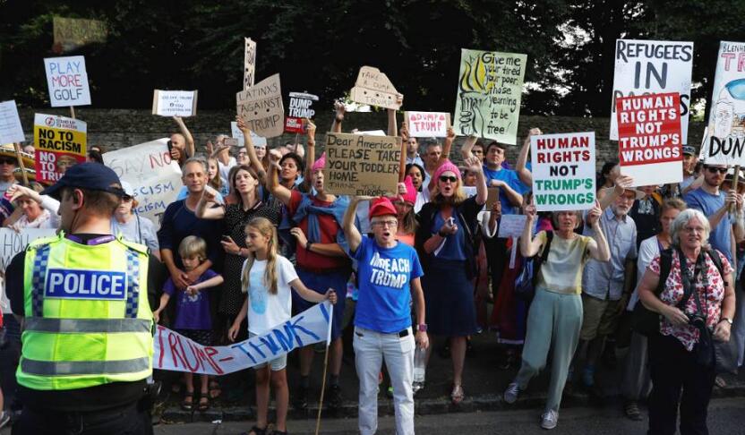 此时,抗议人群聚集在布莱尼姆宫外对特朗普访英进行抗议。