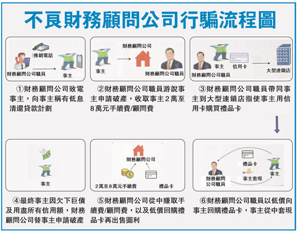 【香港商報網訊】記者區天海報道:自政府大力宣傳「借錢梗要還,咪畀錢中介」後,不法財務中介公司歛財活動一度偃息旗鼓,但近日有集團以新手法進行詐騙,透過無法再向銀行借貸人士到大型電子連鎖商店「碌爆卡」,購入大量禮品卡後申請破產,中介公司佯稱收購禮品卡,實質收取巨額手續費。警方昨日表示,已於上周拘捕7人,包括3名「準備破產」顧客,涉案金額達56萬元。警方再次提醒市民,刻意「碌爆卡」再申請破產,同樣要負上刑責。