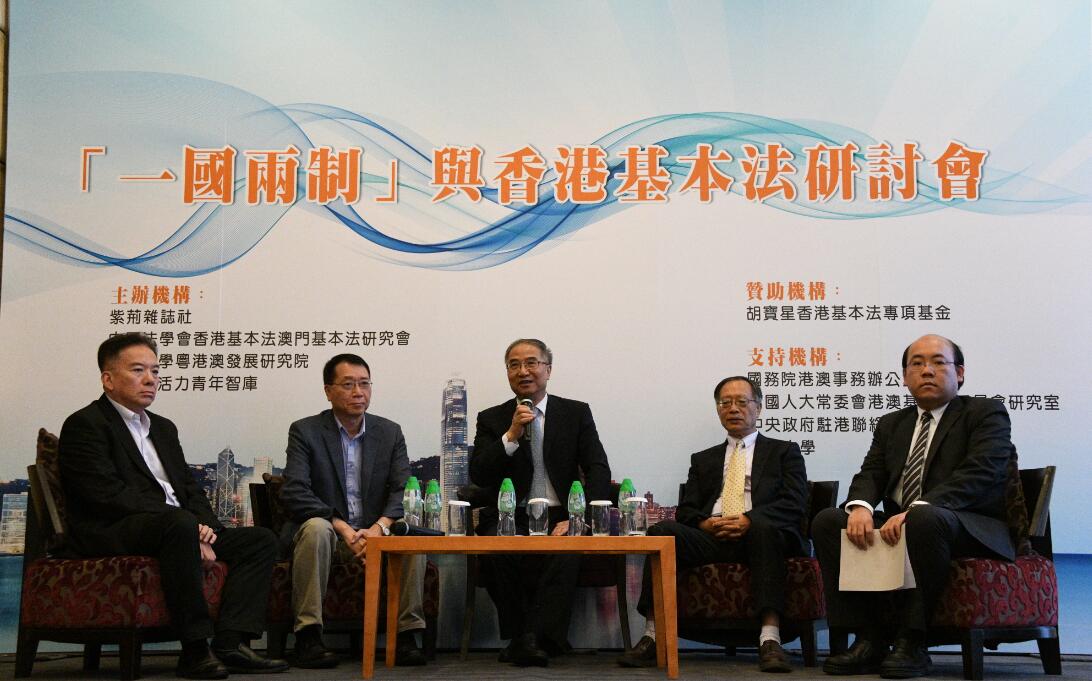 左起:港區全國人大代表黃友嘉、香港科技大學榮譽院士雷鼎鳴、全國港澳研究會副會長饒戈平、深圳大學港澳基本法研究中心副主任張定淮、全國港澳研究會理事周文港出席《基本法》研討會。記者馮俊文攝