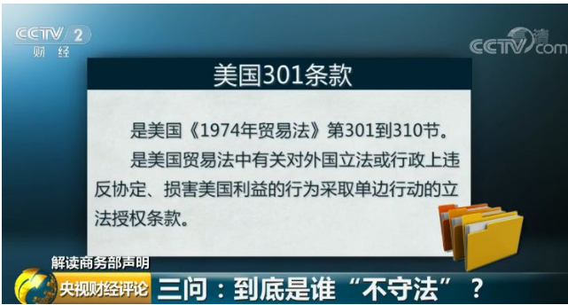 “301条款”是美国《1974年贸易法》第301到310节。“301条款”是美国贸易法中有关对外国立法或行政上违反协定、损害美国利益的行为采取单边行动的立法授权条款。美国彼得森国际经济研究所高级研究员查德?鲍恩曾比喻,在301调查中,美国政府既是警察(判断外国政府是否有错)、检察官(提起诉讼),又是陪审团(甄别证据)、法官(决定是否采取报复性措施)。