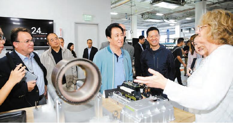 FF高管向许家印介绍其自主研发的「三电」动力总成技术。