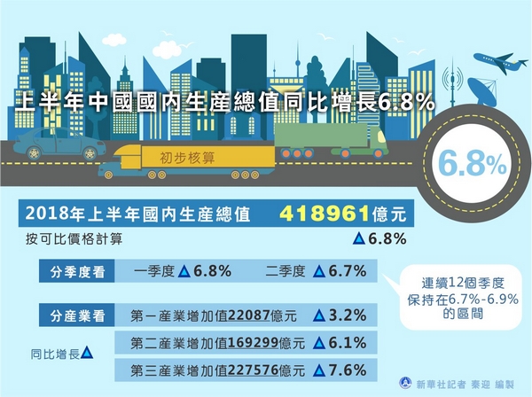【香港商報网訊】據新華社報道,國家統計局昨日發布最新數據,初步核算,上半年國內生產總值(GDP)418961億元,按可比價格計算,同比增長6.8%。分季度看,一季度同比增長6.8%,二季度增長6.7%,連續12個季度保持在6.7%至6.9%的區間。中國經濟穩中向好態勢愈加明顯,對此,國家統計局新聞發言人毛盛勇指,支撐經濟邁向高質量發展的有利條件正積累增多,惟外部環境不確定性亦增多,須保持戰略定力,堅持以供給側結構性改革為主線,確保經濟平穩健康運行。(尚有相關重要新聞刊A2版)