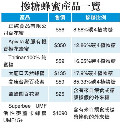 另外,測試亦發現有7款蜂蜜摻雜了外來糖,其中6款檢出摻糖的一般蜂蜜,當中4款摻糖程度較大,由約13%至85%不等。其中1款以「百花蜜」為名稱的樣本,配料表列明成分為「百花蜜、果糖」,但測試結果卻顯示摻雜的是主要來自玉米和甘蔗糖漿的碳4植物糖,含量高達85%;另有1款售價逾1000元的麥蘆卡蜂蜜中亦檢出外來糖。而新鮮度方面,測試發現多款樣本並未如理想,甚至出現發酵或變味等問題。