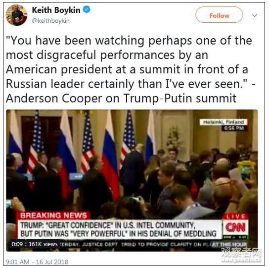 CNN政治评论员基思·柏金(Keith Boykin)在推特上引用了CNN主播库伯(Anderson Cooper)的话:“这是我见过了美国总统在与一位俄罗斯领导人的峰会上,最不光彩的表演之一。”