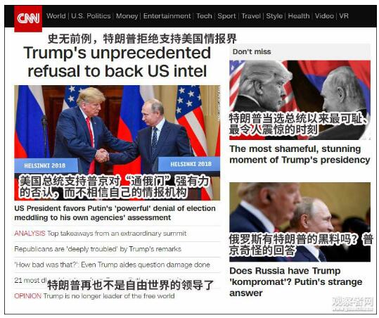 CNN的首页一如既往,火药味十足,似乎要极力将特朗普塑造成美国的“罪人”。其首页标题对特朗普在“通俄门”一事上站在普京的一边而感到震惊。