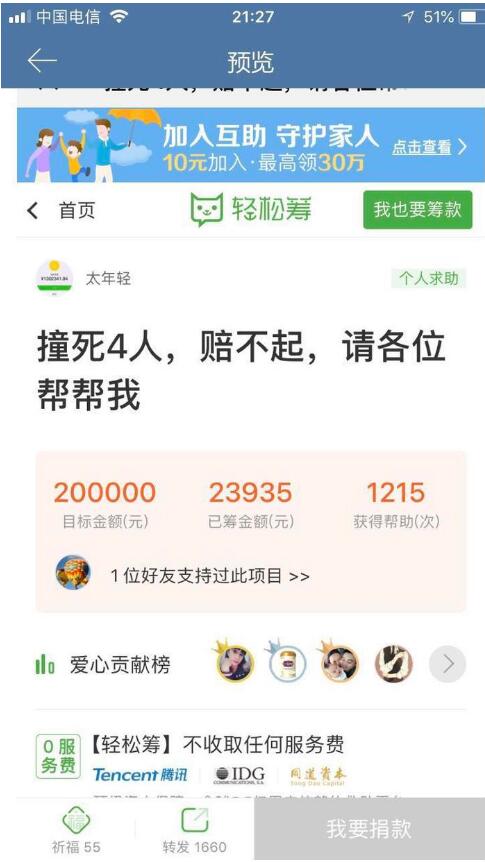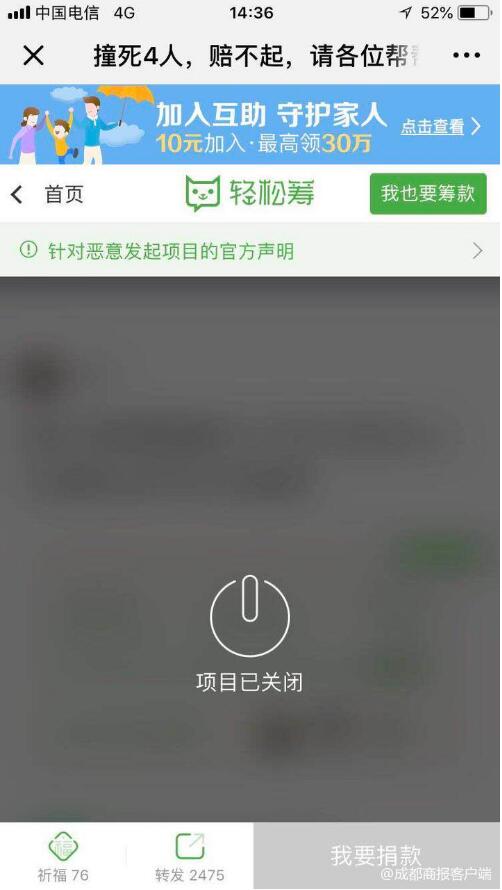 然而10日上午,戏剧性一幕出现。当事车主杨龙在网络上发起众筹赔款。成都商报记者看到,当时在“轻松筹”平台上,杨龙以《撞死4人,赔不起,请各位帮帮我!》为标题发起众筹,目标金额为20万。
