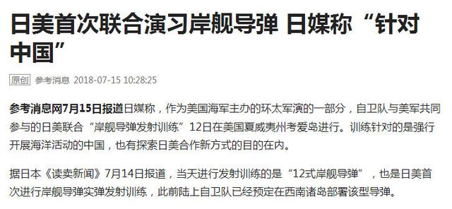 就在前两天,国内很多主流媒体报道了日美首次联合演习岸舰导弹,日媒称“针对中国”的消息。
