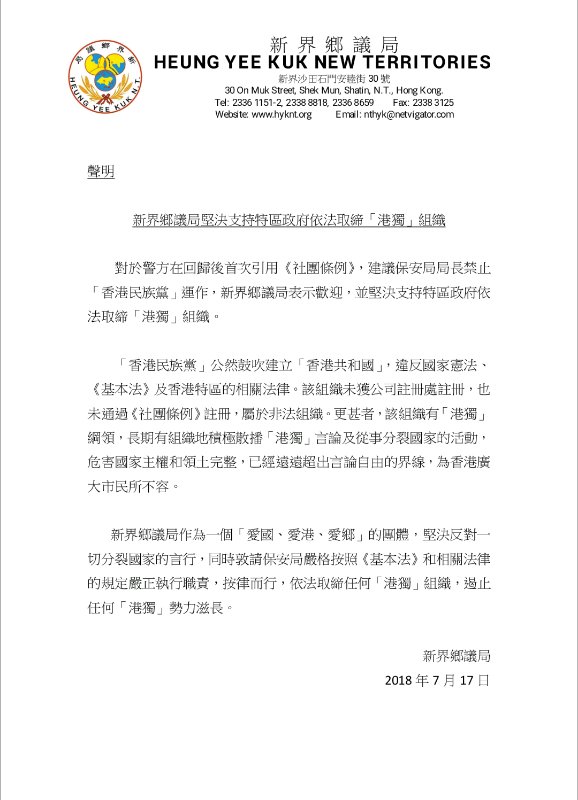 新界乡议局发表声明指,对政府做法表示欢迎,并坚决支持特区政府依法取缔“港独”组织。