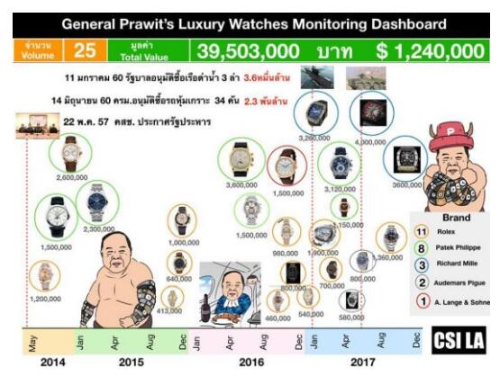 但巴逸最为国人熟知的,可能就是他身上背负的“贪腐指控”。2017年12月,泰国《曼谷邮报》曝光巴逸戴24款奢侈名表的照片,估算这些手表总价值高达120万美元。对此,中国媒体则直接称其为“泰国表哥”。