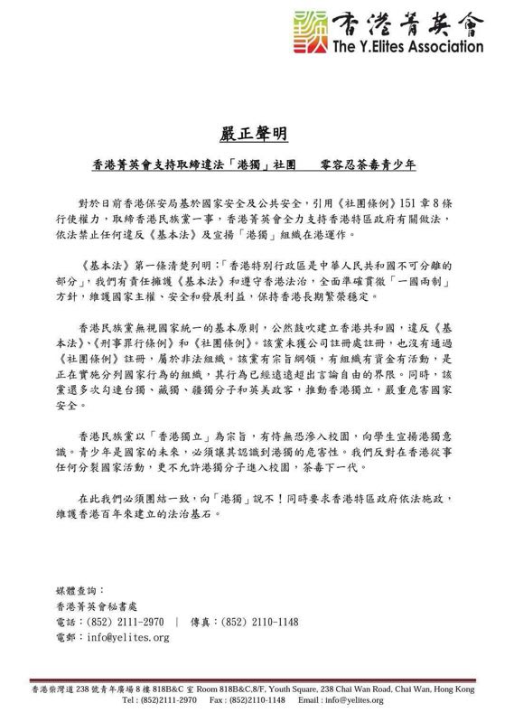 对于日前香港保安局基于国家安全及公共安全,考虑引用《社团条例》151章8条行使权力,取缔香港民族党一事,香港菁英会发表声明 :全力支持香港特区政府有关做法,依法禁止任何违反《基本法》及宣扬「港独」组织在港运作。