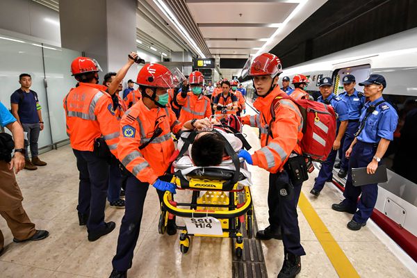 在昨日進行的聯合演習中,消防員拯救「受傷的乘客」,并協助他們前往香港西九龍站的安全位置。