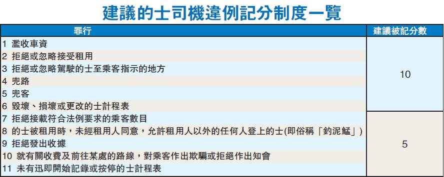 為提升的士服務質素及加強整體阻嚇性,政府建議參考現行的違例駕駛記分制度,引入的士司機違例記分制度,據港府昨日向立法會提交文件,簡介記分制度詳情(見附表)。的士司機若有以下6種行為,有機會被記10分,當中包括濫收車資、拒載、兜路、兜客、以及毀損、損壞及更改的士咪表。至於涉及記5分的行為,包括拒絕接載符合法例要求的乘客數目、「釣泥鯭」、拒絕發出收據、就有關收費及前往某處的路線,對乘客作出欺騙或拒絕作出知會、未有迅即開始記錄或按停的士咪表。