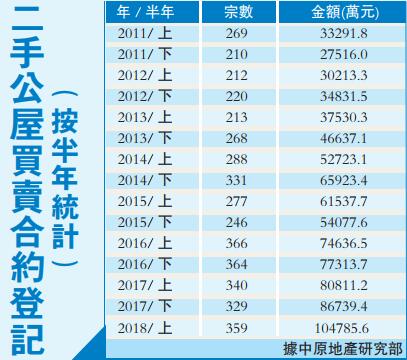 中原地產研究部高級聯席董事黃良昇指出,2018年上半年二手公屋買賣合約登記錄得359宗,總值10.48億元,較2017年下半年的329宗及8.67億元,分別上升9.1%及20.9%。金額升破十億元水平,是創2000年下半年有紀錄以來的十八年歷史新高,而宗數是創2016年下半年364宗后的三個半年度新高。反映樓市及經濟向好,用家的買樓意欲及能力明顯提升,帶動上半年公屋交投暢旺。樓價持續上升,刺激高價公屋成交頻現,推升整體二手公屋登記總值。