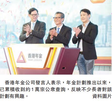 【香港商報网訊】記者姚一鶴報道:金管局昨公布,香港按揭證券公司旗下香港年金公司所推出的「香港年金計劃」,今日起開始接受登記認購意向。香港年金公司發言人表示,該計劃在7月6日正式推出以來,已累積收到約1萬宗公眾查詢,反映不少長者對該計劃有興趣。