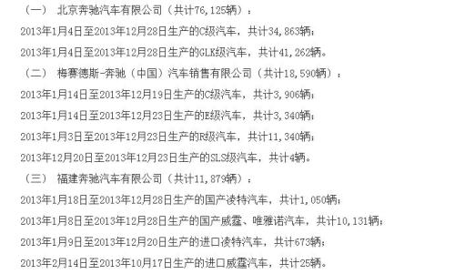 18日,国家市场监督管理总局发布消息称,北京奔驰、梅赛德斯-奔驰(中国)、福建奔驰因配件供应原因,决定自2019年4月30日起召回2013年生产的部分车辆,共计106594辆。这些车辆在空气囊展开时,气体发生器可能发生异常破损,导致碎片飞出,伤及车内人员,存在安全隐患。拥有奔驰的你,“中招”了吗?