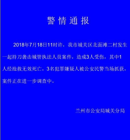 据甘肃省兰州市公安局城关公安分局官微7月18日消息,当日上午11时许,该市城关区北面滩二村发生一起持刀袭击城管执法人员案件。