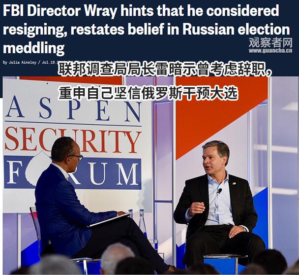 美国《商业内幕》杂志网站7月19日报道,联邦调查局(FBI)局长克里斯托弗·雷(Christopher Wray)当日在阿斯本安全论坛(Aspen Security Forum)答问时称,“从反情报角度来看,中国作为一个国家来说,是我们面临的最广泛、最具挑战性、最严重的威胁。”