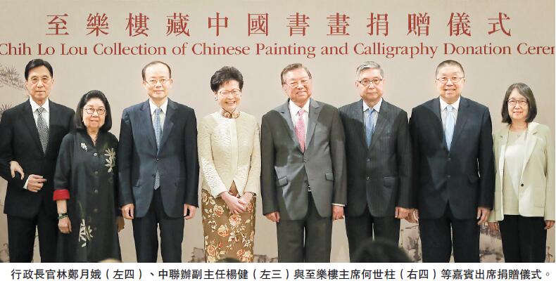 對於至樂樓決定355件精品捐贈予香港藝術館作永久收藏,林鄭月娥表示非常感謝,認為是為廣大市民送上無價的瑰寶,更為書畫的傳承寫下動人的篇章,今次捐贈不但秉持了何老先生弘揚國粹的初心,延續了其高尚的情操,亦有助提升香港藝術館的國際地位。她希望今次善舉能鼓勵更多私人收藏家化私為公,與市民分享珍藏,並凝聚民間的力量,合力推動香港文化藝術的發展。