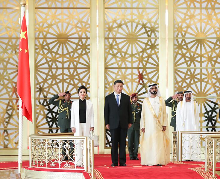 习近平和彭丽媛在穆罕默德副总统兼总理、穆罕默德王储陪同下前往检阅大厅,仪仗队列队迎候。鸣21响礼炮。习近平和彭丽媛同穆罕默德副总统兼总理共同登上检阅台。军乐队奏中国国歌。国歌毕,习近平和彭丽媛在穆罕默德副总统兼总理、穆罕默德王储陪同下前往会见厅,同阿联酋主要内阁部长和重要王室成员等阿方迎接人员握手。穆罕默德副总统兼总理、穆罕默德王储同中方陪同人员握手。习近平同穆罕默德副总统兼总理、穆罕默德王储亲切交谈。