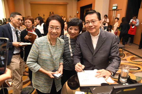 張炳良(右)於發布會上為新書簽名,左為婦女事務委員會主席陳婉嫻。記者崔俊良攝