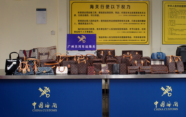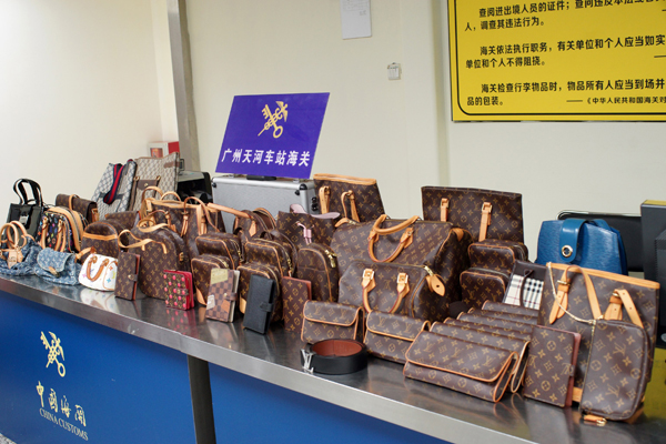 广州天河车站海关在进境旅检渠道查获旅客违规携带大量名牌挎包入境--巢家敏摄