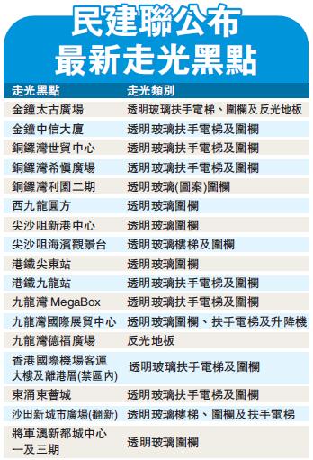 民建聯第8年公布及揭露走光黑點,今年委員會揭示了17個走光黑點,包括各大型購物商場、機場、觀光景點、娛樂及展覽商廈、港鐵站等。