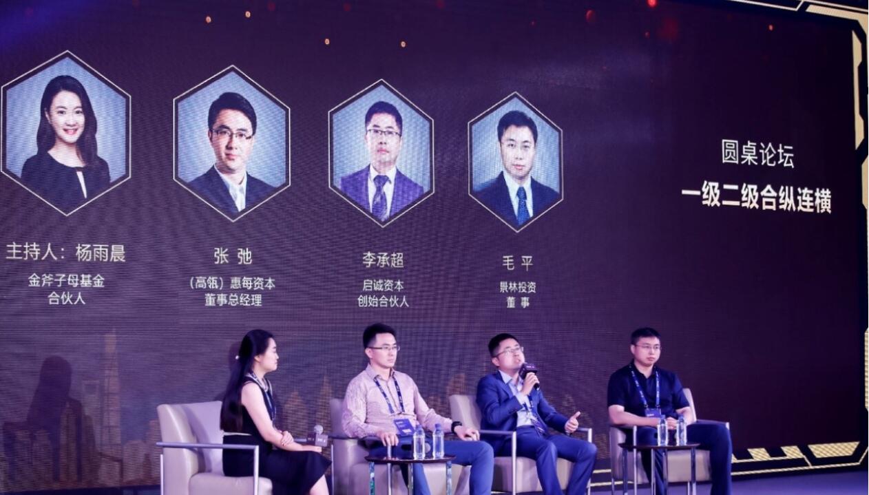 在圆桌论坛环节,展开主题为《一级二级合纵连横》的讨论,金斧子母基金合伙人杨雨晨主持论坛,(高瓴)惠每资本董事总经理张弛、启诚资本创始合伙人李承超、景林投资董事毛平纷纷就当下经济周期中一级市场和二级市场的周期性投资机会进行深入浅出的解读。