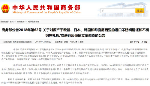 自本公告发布之日起,商务部对原产于欧盟、日本、韩国和印度尼西亚的进口不锈钢钢坯和不锈钢热轧板/卷进行反倾销立案调查,本次调查确定的倾销调查期为2017年1月1日至2017年12月31日,产业损害调查期为2014年1月1日至2018年3月31日。