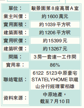 至於買賣成交個案,7月份亦有與上述放售單位類似單位成交。9座高樓E室,7月初以1638萬元易手,以實用面積約1039平方呎計,成交呎價高達約15765元。建築面積約1206平方呎,建築呎價約13582元。