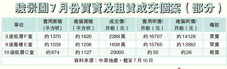 租賃成交個案方面,10座低層C室,7月以每月租金約2.9萬元租出,實用面積約974平方呎,每月實用呎租約30元。建築面積約1127平方呎,建築呎租約26元。
