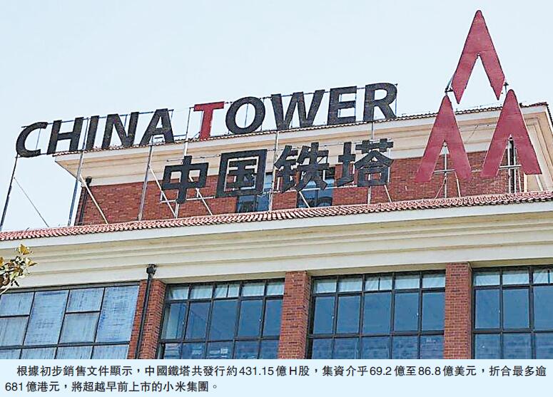 根據初步銷售文件顯示,中國鐵塔共發行約431.15億H股,集資介乎69.2億至86.8億美元,折合最多逾681億港元,將超越早前上市的小米集團(1810)。
