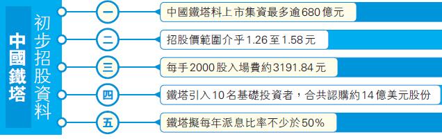 市場早前消息指,中國鐵塔最初計劃在本月12日招股,最快在26日上市,其後延遲至20日招股。不過,時間表一再改動,料集團本周三(25日)才展開公開招股。8月1日定價,8月8日上市,招股價範圍介乎1.26至1.58元,每手2000股入場費約3191.84元。