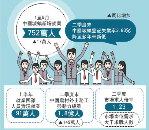 盧愛紅續稱,上半年中國經濟結構調整深入推進,新舊動能持續轉換,質量效益穩步提升,也對擴大就業、提高就業質量形成了有力的拉動。一是經濟保持中高速增長,上半年國內生產總值同比增長6.8%,連續12個季度穩定運行在6.7%至6.9%之間,對就業的帶動效應不斷增強;二是經濟結構優化升級,第三產業增加值佔國內生產總值比重繼續提高,達到54.3%,第三產業就業人數不斷增加,吸納就業的能力進一步增強;三是中國大眾創業、萬眾創新蓬勃發展,營商環境不斷改善,市場主體不斷湧現,上半年日均新登記市場主體1.81萬戶,創造了大量新的就業崗位。