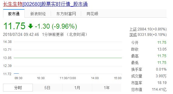今日长生生物(11.75 -9.96%,诊股)股价再度跌停开盘,报11.75元/股,连续7日跌停,总市值蒸发124.7亿元。