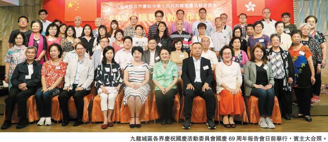 【香港商報网訊】記者張芃芃報道:九龍城區各界慶祝國慶活動委員會日前假紅磡海逸皇宮大酒樓舉行國慶69周年報告會,中聯辦九龍工作部副部長王小靈、九龍城區各界國慶籌委會主席朱蓮芬等,聯同九龍城區各界國慶籌委會成員及600餘名街坊出席。朱蓮芬表示,九龍城區各界將於7月至10月主辦了一系列國慶活動,包括國慶報告會、國慶盃粵曲比賽、粵曲及折子戲欣賞、及內容豐富的嘉年華,為九龍城居民帶來一個開心、精彩的國慶佳節。