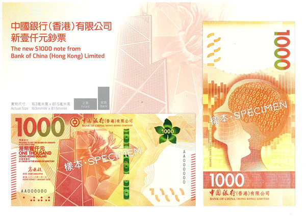 是次新鈔設計中,1000元新鈔主題為國際金融中心,如何才能恰當地展現香港的金融呢?邵國偉介紹,他和設計團隊認為,金融當中最重要是「人」的智慧,所以決定1000元新鈔以兩個頭部側影作為主要元素,代表人類智慧在金融發展中起了重要性的作用,寓意香港金融市場人才濟濟,生生不息。