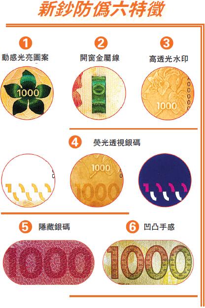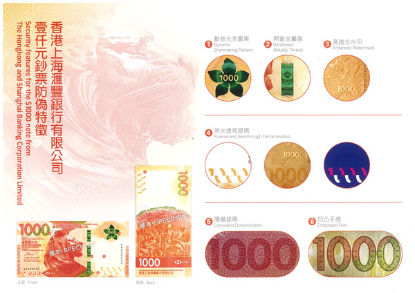 是次新鈔主要利用6種防偽特徵,置於各新鈔5個相同位置上,當中包括動感光亮圖案,只需輕微傾斜鈔票,圖案中的閃光圓環會隨之轉動,開窗金屬線上亦有大、小閃亮圓環會隨鈔票轉動。另外亦有以紫荊花為主題的高透光水印,鈔票背光時可見花、葉、花蕾和銀碼數字。將鈔票放於紫外光下會顯現兩種熒光顏色,背光時則可見兩面的圖案拼合成銀碼數字。除此之外,在光源下傾斜鈔票,會浮現隱藏銀碼數字,更有使用凹版印刷造成的凹凸手感。