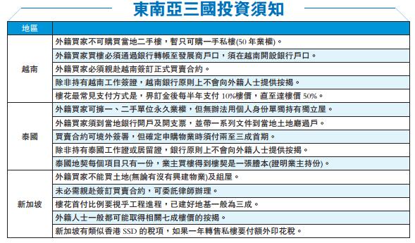 就可向銀行借錢買樓方面,新加坡中原地產總經理許大衛指出,泰國與越南情况相若,由於怕「外國人炒貴當地樓」,除非有工作證明或居住證,當地銀行原則上是不貸款予港人買樓。假如真的想做樓按,可考慮新加坡,當地有不少國際銀行,都可向非新加坡籍人士提供樓按,一般最高達七成,息口由1.8厘至2厘。「當然,新加坡樓價亦比泰國高很多,泰國最低幾十萬元可上車,新加坡動輒要百幾萬元起」。
