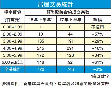 按物業價值劃分,價值200萬元至499萬元的三個細碼組別全線向下,當中價值200萬至299萬元的組別交投跌幅顯著,期內僅錄得19宗買賣個案,物業成交總值0.52億元,量值同樣較去年下半年大幅減少57%;至於價值500萬至599萬元及600萬元或以上的「貴價」組別,則按半年大增34%及61%,至172宗及148宗。