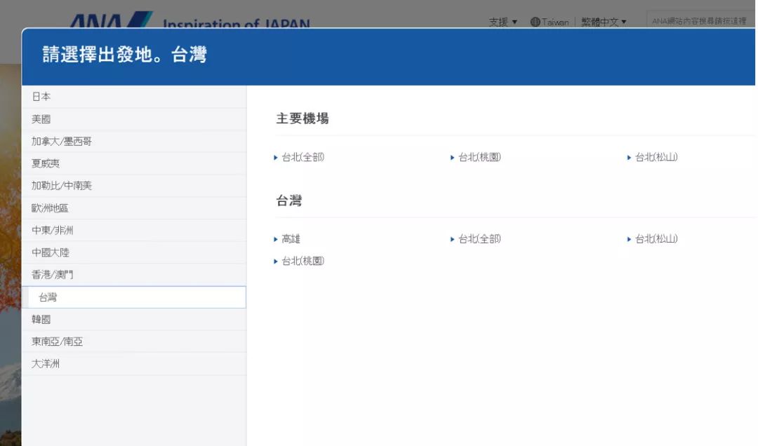 全日空简、繁、英三版页面中有关台湾和港澳的不同表述